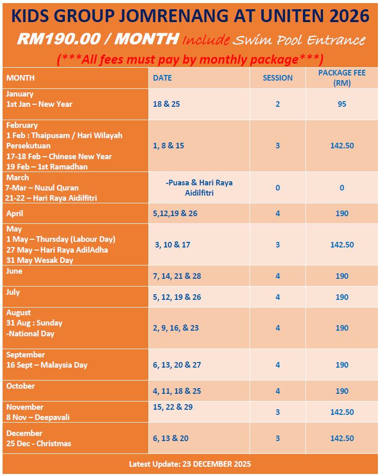 *Class fees will change according to the latest pool rental rates. Note: The schedule may change according to the current situation This is a monthly fee package, if cannot commit with monthly package, then we suggest for ala-card class link below: |